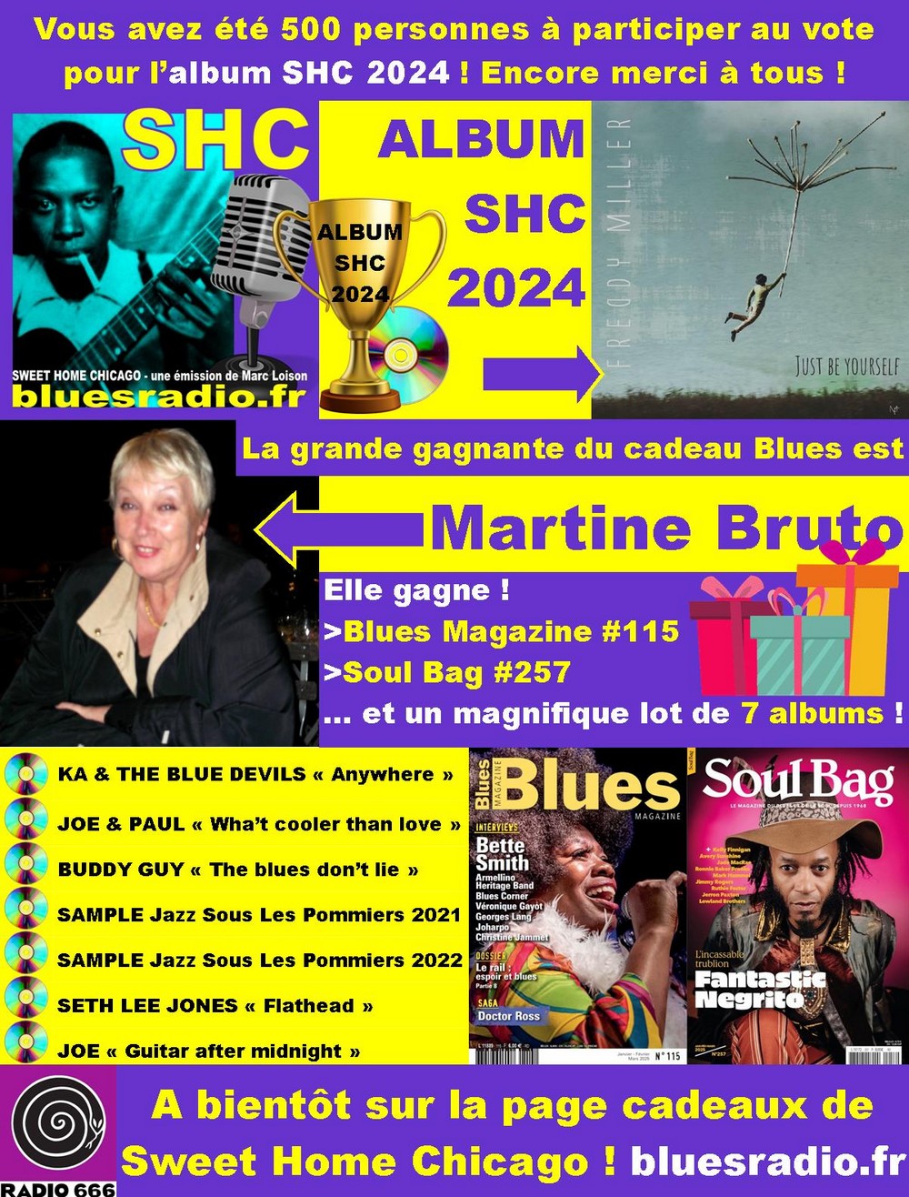 REGLEMENT Article 1 Vous avez régulièrement rendez-vous ici pour gagner des cadeaux : CD blues, revues blues, places de concerts blues, etc... Article 2 Seuls les gagnants sont avisés personnellement par e-mail: tous les autres participants sont invités à consulter les résultats des tirages au sort après la date indiquée pour la fin des concours, ou la liste générale des gagnants. Article 3 Sweet Home Chicago ne peut en aucun cas être tenu pour responsable d'une éventuelle annulation des concerts ou d'un défaut d'acheminement de la Poste. Article 4 Seules sont prises en compte les réponses comportant les coordonnées postales du participant: sans adresse postale, les participations sont nulles. Article 5 Toute personne physique peut concourir, quel que soit son emplacement géographique, à raison d'une participation par foyer. Article 6 Sweet Home Chicago s'engage formellement à n'utiliser et à ne communiquer à personne ni votre adresse e-mail, ni votre adresse postale. Article 7 En participant, vous certifiez avoir pris connaissance du présent règlement. Article 8 Le retour par mail des gagnants du style "J'ai bien reçu mon lot, merci" à sweethomechicago666@orange.fr est fortement apprécié. |