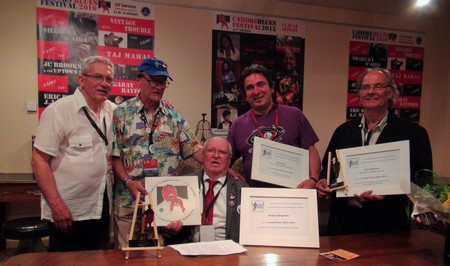 Cahors, 15 juillet 2016 de gauche à droite : Jean Guillermo, président de France Blues / Robert Mauriès, président du Cahors Blues Festival / Jacques Morgantini, l'homme qui a apporté le Blues à la France / Marc Loison, animateur de Sweet Home Chicago / Christian Le Morvan, rédacteur en chef de Blues Magazine.